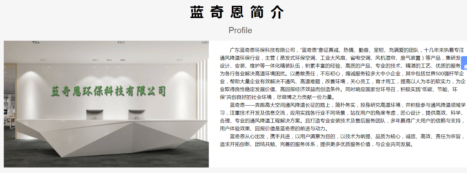 廣東藍奇恩環保科技有限公司,“藍奇恩”象征真誠、熱情、勤奮、堅韌、充滿愛的團隊,十幾年來執著專注通風降溫行業,主營(工業大風扇、省電空調、風機濕簾、廢氣裝置)等產品,集研發、設計、安裝、維護等一體化精裝隊伍,積累豐富的經驗、高質的產品、專業的技術,為各行各業解決高溫環境困擾。以勇敢責任,不忘初心,竭誠服務較多大中小企業,其中包括世界500強桿竿企業,幫助大量企業解決不通風、高溫難題,關心員工,育才用工,提高以人為本的軟實力,為企業取得良性穩定發展價值、高回報經濟效益而創造條件。同時響應國家世環號召,積極實踐“低碳、節能”共創良好的社會環境,盡微博之力貢獻一份力量。