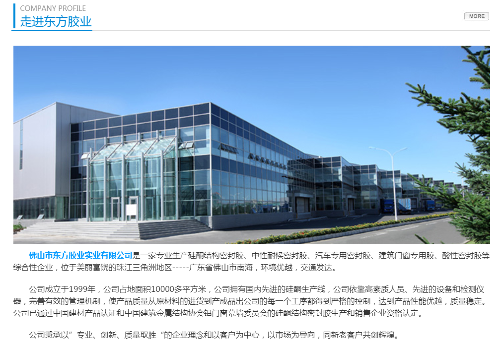 佛山市東方膠業實業有限公司是一家專業生產硅酮結構密封膠、中性耐候密封膠、汽車密封膠、建筑門窗膠、酸性密封膠等綜合性企業,位于美麗富饒的珠江三角洲地區-----廣東省佛山市南海,環境優越,交通發達。
