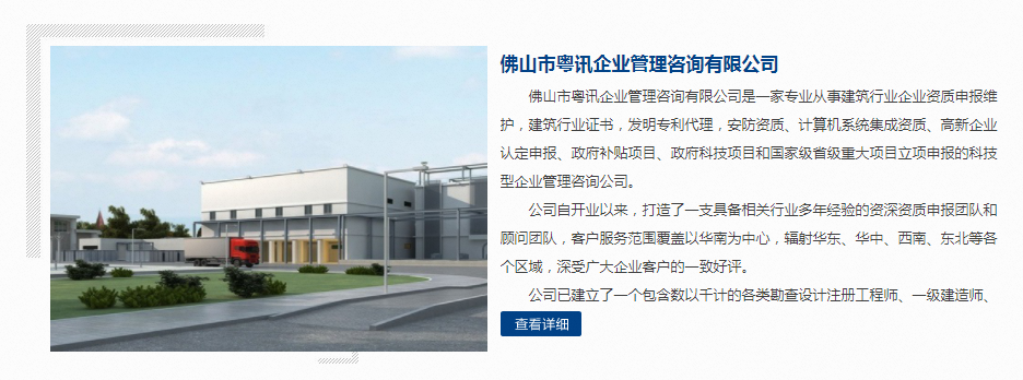 佛山市粵訊企業管理咨詢有限公司是一家專業從事建筑行業企業資質申報維護,建筑行業證書,發明專利代理,安防資質、計算機系統集成資質、高新企業認定申報、政府補貼項目、政府科技項目和省級重大項目立項申報的科技型企業管理咨詢公司。