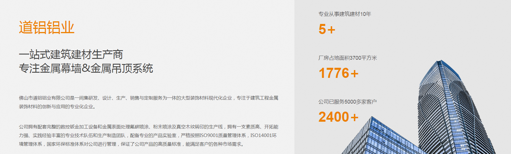 佛山市道鋁鋁業有限公司是一間集研發、設計、生產、銷售與定制服務為一體的大型裝飾材料現代化企業,專注于建筑工程金屬裝飾材料的創新與應用的專業化企業。