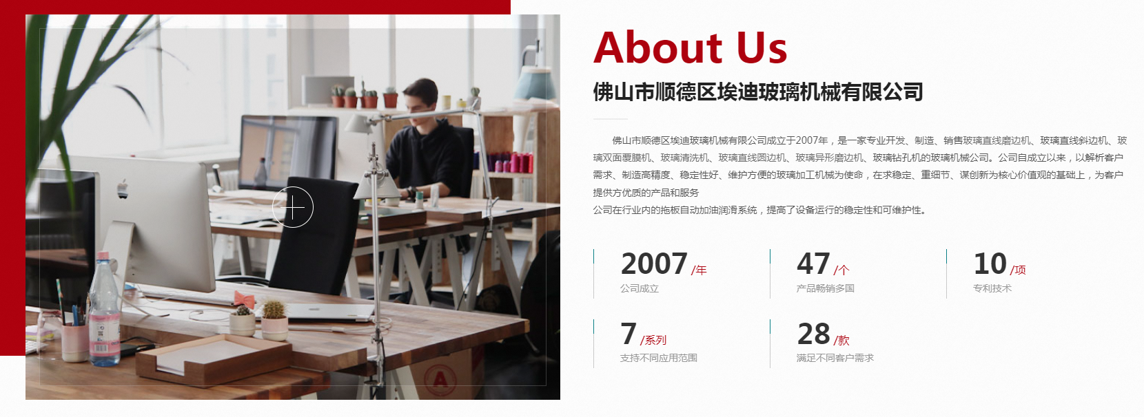 佛山市順德區埃迪玻璃機械有限公司成立于2007年,是一家專業開發、制造、銷售玻璃直線磨邊機、玻璃直線斜邊機、玻璃雙面覆膜機、玻璃清洗機、玻璃直線圓邊機、玻璃異形磨邊機、玻璃鉆孔機的玻璃機械公司。公司自成立以來,以解析客戶需求、制造高精度、穩定性好、維護方便的玻璃加工機械為使命,在求穩定、重細節、謀創新為核心價值觀的基礎上,為客戶提供產品和服務