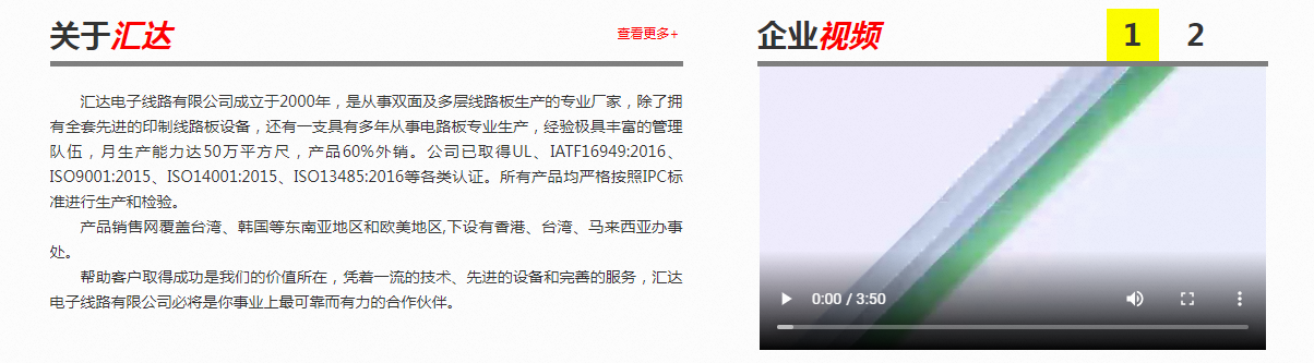 匯達電子線路有限公司成立于2000年,是從事雙面及多層線路板生產的專業廠家,除了擁有全套先進的印制線路板設備,還有一支具有多年從事電路板專業生產,經驗具有豐富的管理隊伍,月生產能力達50萬平方尺,產品60%外銷。公司已取得UL、IATF16949:2016、ISO9001:2015、ISO14001:2015、ISO13485:2016等各類認證。所有產品均嚴格按照IPC標準進行生產和檢驗。