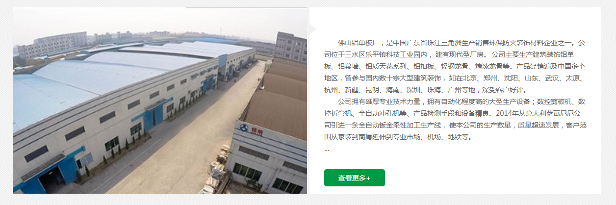 廣東佛山鋁單板廠,是廣東省珠江三角洲生產銷售防火裝飾材料企業之一。公司位于三水區樂平鎮科技工業園內,建有現代型廠房。 公司主要生產建筑裝飾鋁單板、鋁幕墻、鋁質天花系列、鋁扣板、輕鋼龍骨、烤漆龍骨等。產品經銷遍及多個地區,曾參與國內數十宗大型建筑裝飾, 如在北京、鄭州、沈陽、山東、武漢、太原、杭州、新疆、昆明、海南、深圳、珠海、廣州等地,深受客戶好評。
