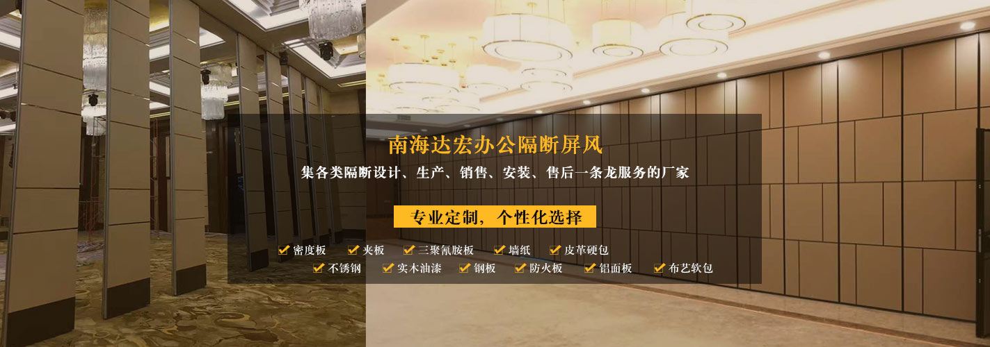 佛山市南海達宏隔斷屏風廠,是活動隔斷,移動隔斷,活動屏風,玻璃隔斷,辦公室玻璃隔斷,生態門,隔斷鋁型材,五金配件整套產品研發,設計,生產,安裝,銷售為一體。 自成立以來,一直致力于隔斷技術的鉆研及開發,創立了專門的研發,一直致力于加強國內外隔斷行業的技術水平交流和學習,并研制出具隔音系統和全方向性轉彎系統。我們的全部技術力量,都多年從事于本行業,親自參與過大量的國內大型重點工程項目的隔斷系統的制作加工和現場安裝工作,已形成一支成熟的隊伍遍布各地。 我們信奉“客戶是天,質量是地,人和為本”的理念“以服務爭業務、以品質創品牌”為宗旨。以好的服務,完善的質量,合理的價格,完善的售后服務贏得廣大客戶的認同及信賴,產品的完善和多樣化配套,滿足了大客戶各種不同空間間隔的使用需求!