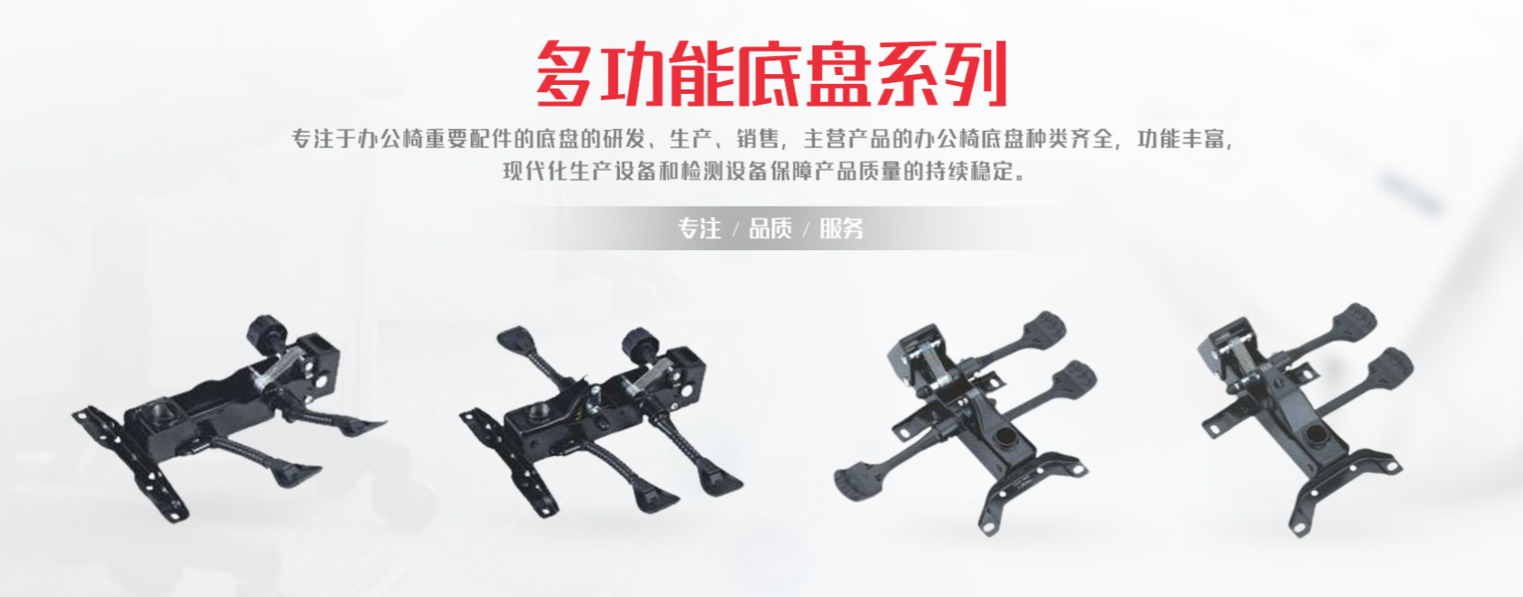 公司主營產品的辦公椅底盤種類齊全,功能豐富,均可通過新的ANSI/BIFMA X5.1-2017標準或EN 1335-2標準測試。我司產品品質在行業內廣受認可,且依托強大的研發能力,能根據客戶自身需求定制產品,以為客戶創造競爭力。